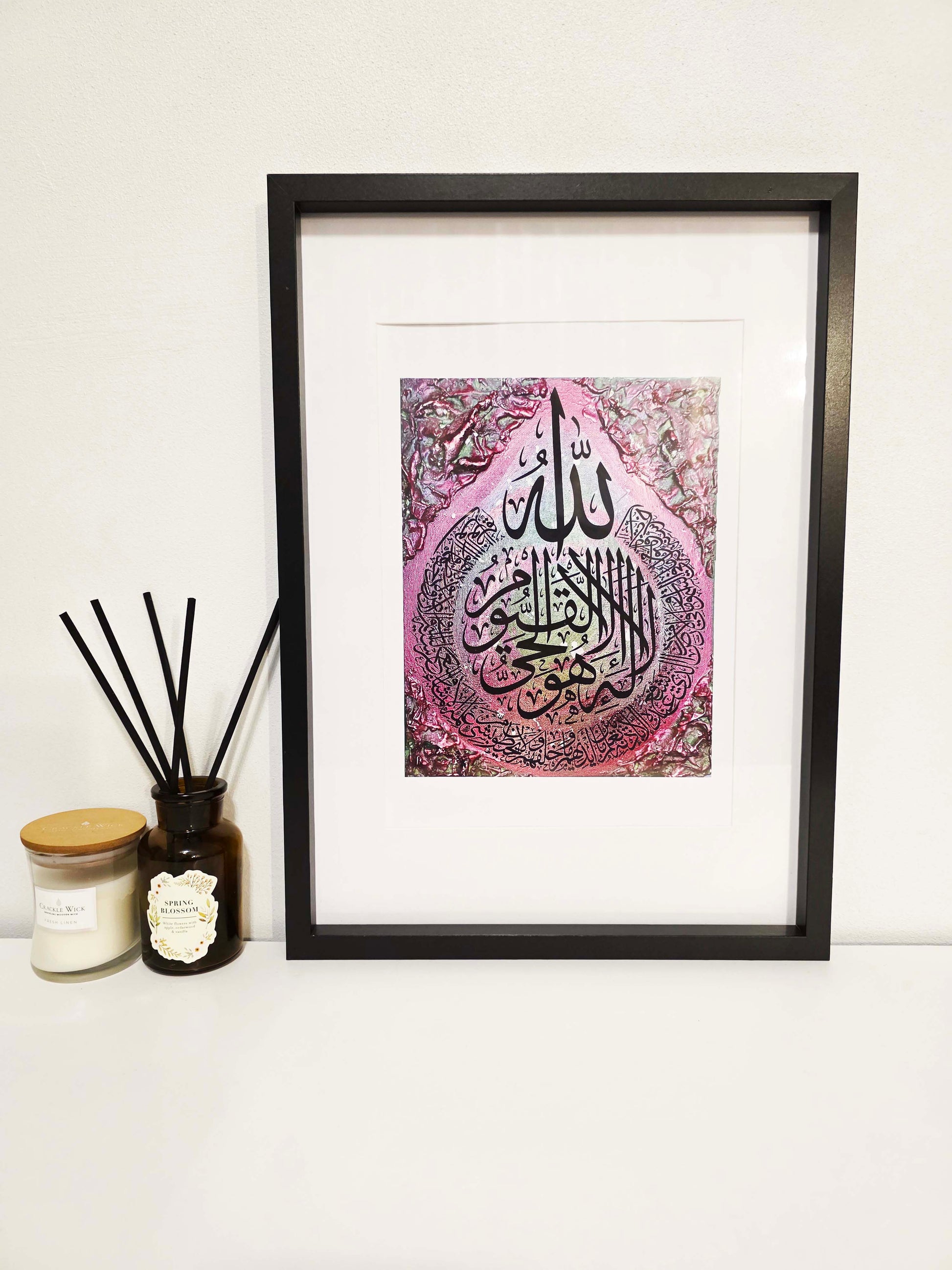 From an original textured artwork, this print features the elegant Teardrop Ayatul Kursi design. Soft green and pink tones flow together to create a calming and graceful composition — a reflection of divine protection and peace. A beautiful reminder to keep close.