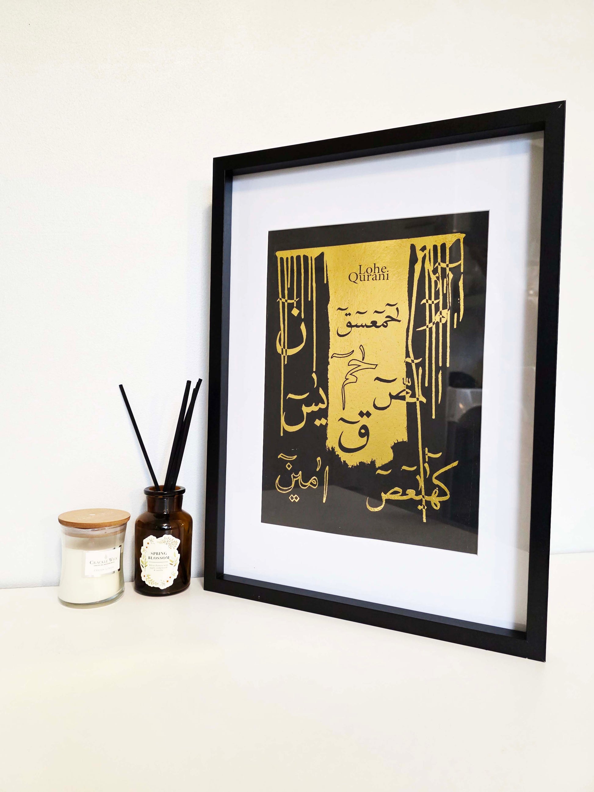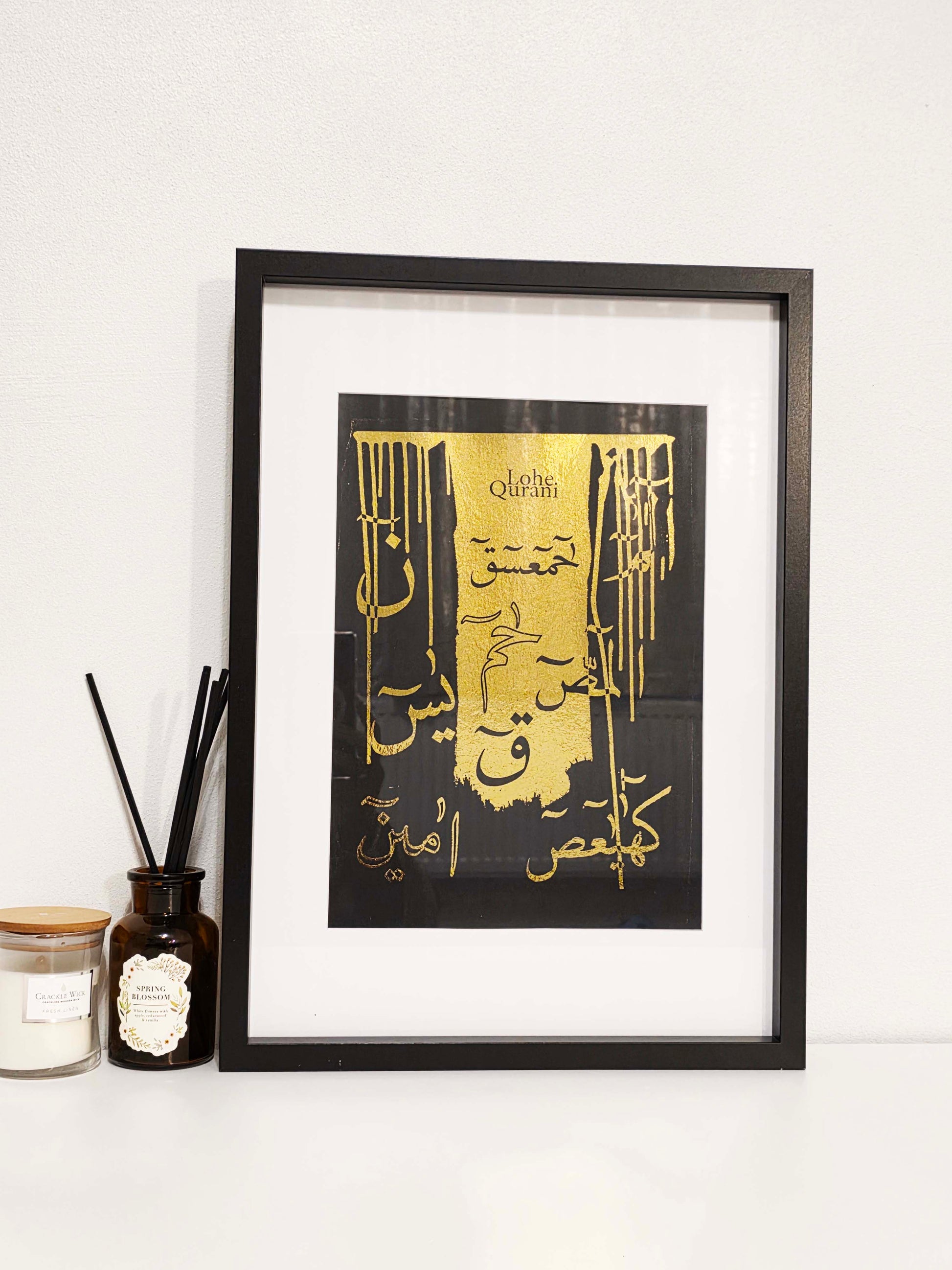 This print features the Lohe Qurani from an original painting on a black background with gold foil, capturing its divine elegance. The letters, unknown to mankind, are drawn from the beginnings of select Quranic verses, representing a mystical wisdom known only to Allah. Symbolic, blessed drips descend from above, changing color as they touch each letter, reflecting the profound spiritual energy embedded in the design.