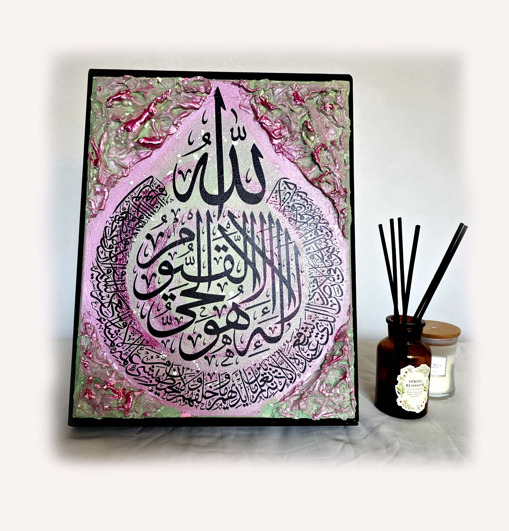 A subtle hue textured tear drop Ayatul Kursi design. Soft green and pink tones flow together to create a calming and graceful composition — a reflection of divine protection and peace. A beautiful reminder to keep close.